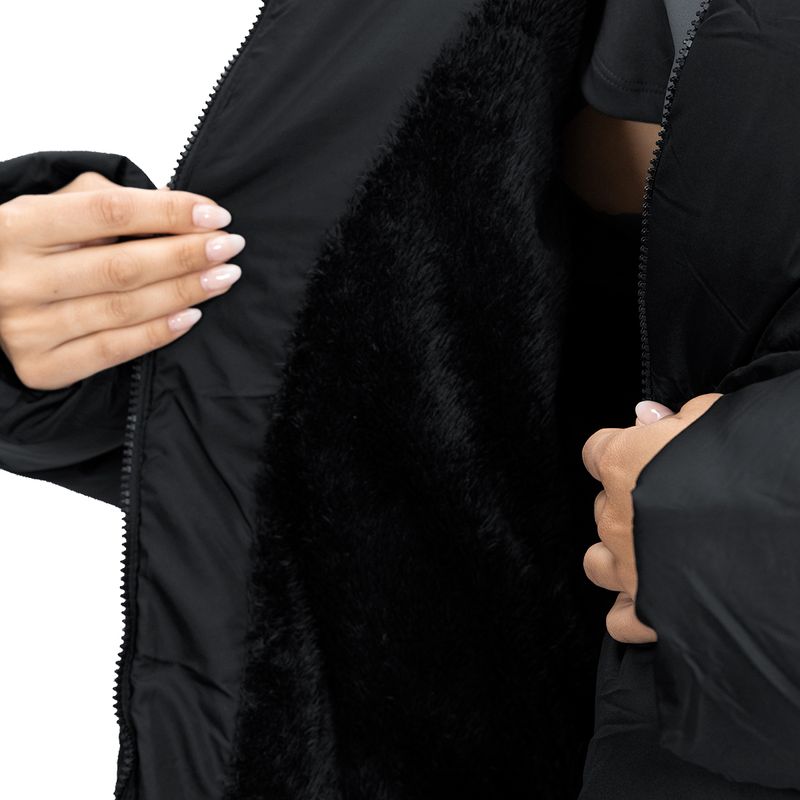 Material: 100% poliéster. Forro interno de peluche. Capucha con cordón regulable. Dobladillo con elástico. Bolsillos laterales con cierre. Origen: nacional.